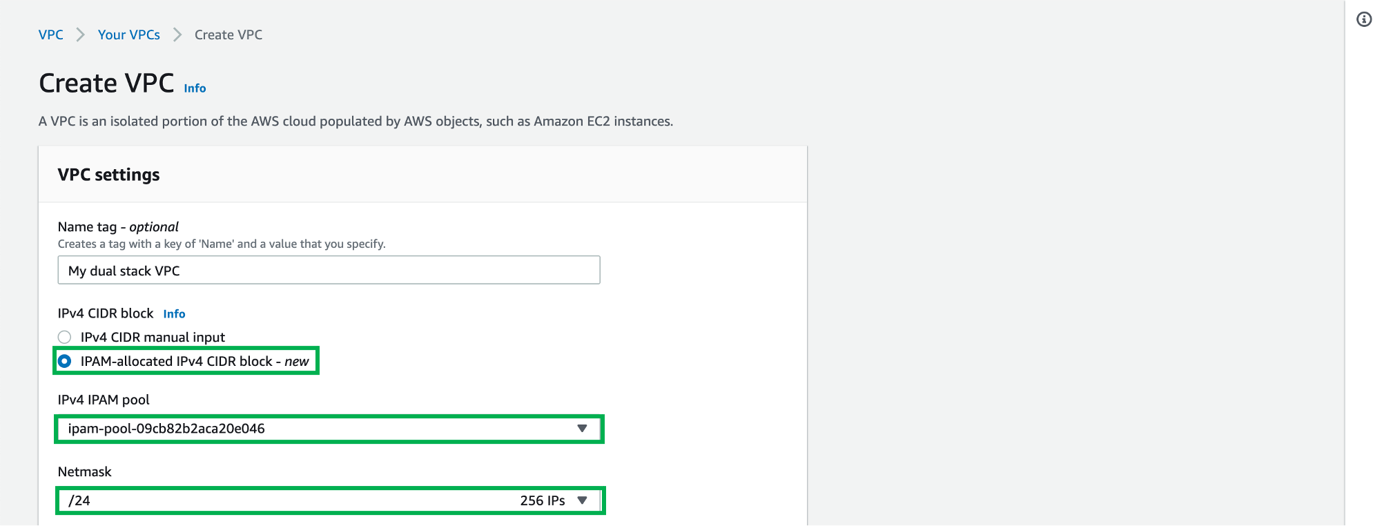 Step 4: Create an Amazon VPC with a /56 CIDR block from the shared pool