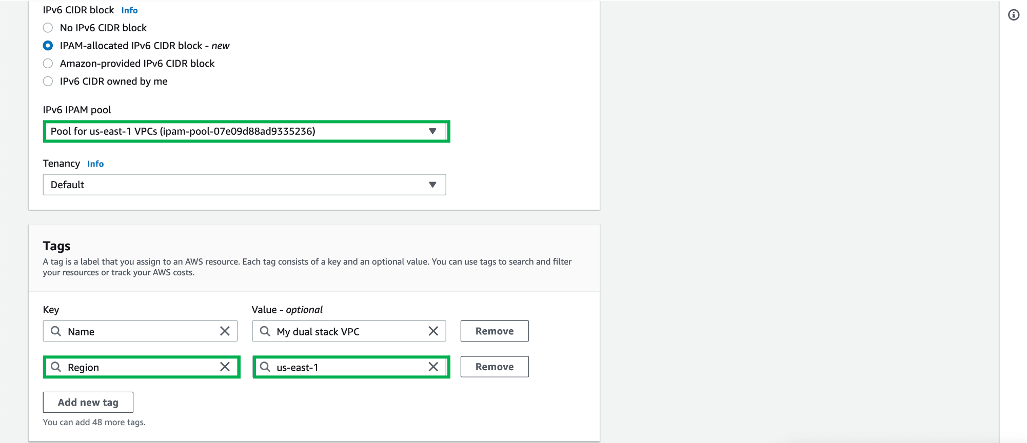 Then, we allocate the IPv6 CIDR from the regional IPAM pool that we created above, as part of the walkthrough, and set the correct Tag value as configured in the allocation policy for compliance: