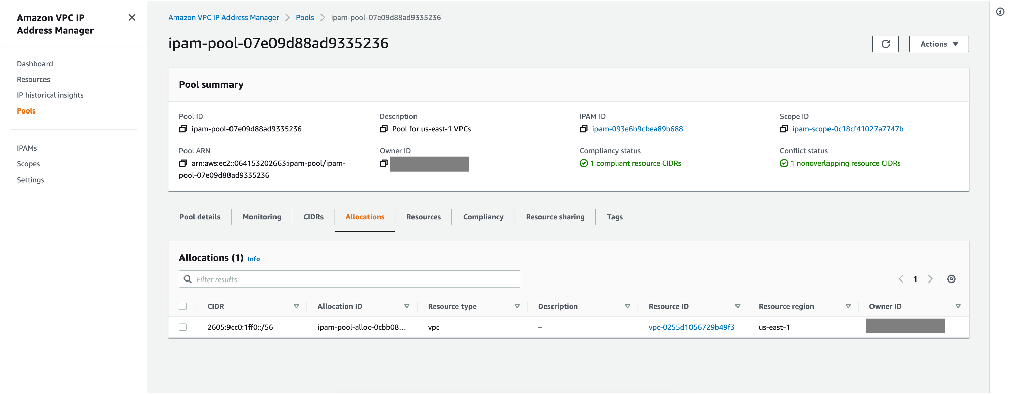 The same configuration steps apply for VPCs in the other regions where we’ve created IPAM pools and had them shared with application accounts. As a final step, you can verify your pool allocation status. For example, for the us-east-1-pool: