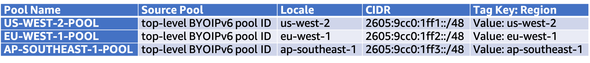 Step 2: Create the regional IPAM pools, provision the the IPv6 CIDRs within each pool in the respective region and advertise them to the Internet