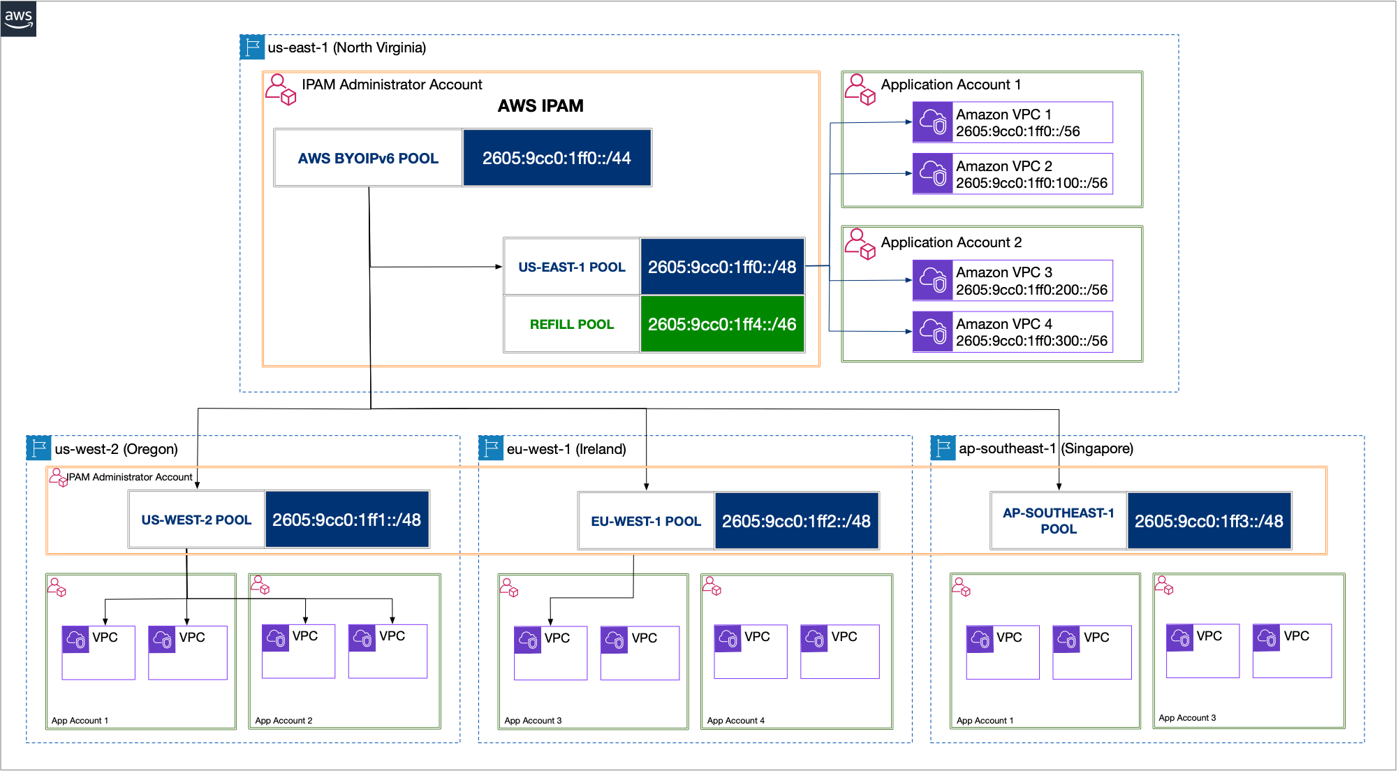 - Optimized management of routing and security domains – With Amazon VPC IPAM you can organize your BYOIPv6 space consistently with the enterprise defined hierarchy (region, routing domain, business unit, etc.). By allocating CIDR blocks from your BYOIPv6 space to each region, environment and business unit, you can optimize route table management, and configure summarization across the network.