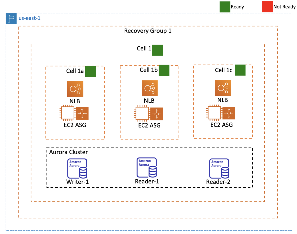 In this Regional cell, we have three nested cells, which represent the replicas in each AZ. We’ll call these the zonal cells. We create readiness checks for resource sets to monitor each type of AWS resource in our stack (NLB, ASG, and Aurora DB Cluster) by providing the Amazon Resource Names (ARNs) of the resources. We also associate each ARN with the related readiness scope (cell) of that resource.