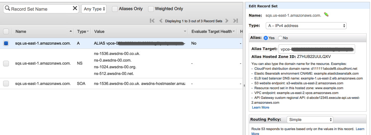 b. Create an alias record called sqs.us-east-1.amazonaws.com that targets the endpoint-specific regional DNS hostname (vpce-12345678-abcdefg.sqs.us-east-1.vpce.amazonaws.com).