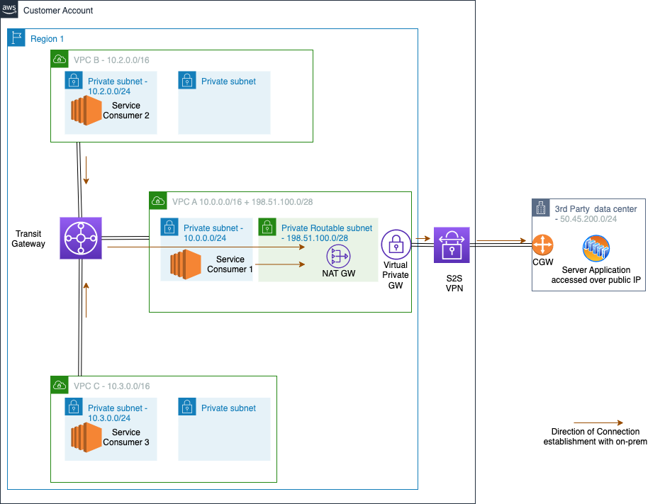 Figure 1: A multi-VPC environment connected to a third-party vendor’s on-premises data center using AWS Site-to-site VPN and private NAT Gateway.