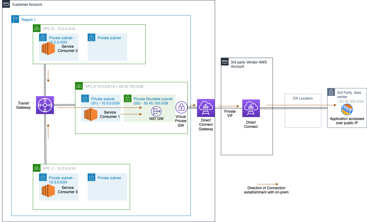 This approach follows the same pattern as scenario one, where you put a Private NAT gateway between the service consumers in your VPCs and the applications residing with the vendor, and the same considerations apply. But because it uses Direct Connect, this approach provides better network performance plus a private network connection.