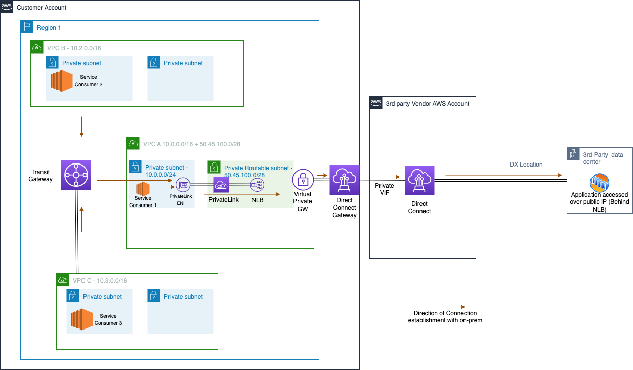 Figure 5: A multi-VPC environment integrated with third-party on-premises through AWS Direct Connect and Network Load Balancer.