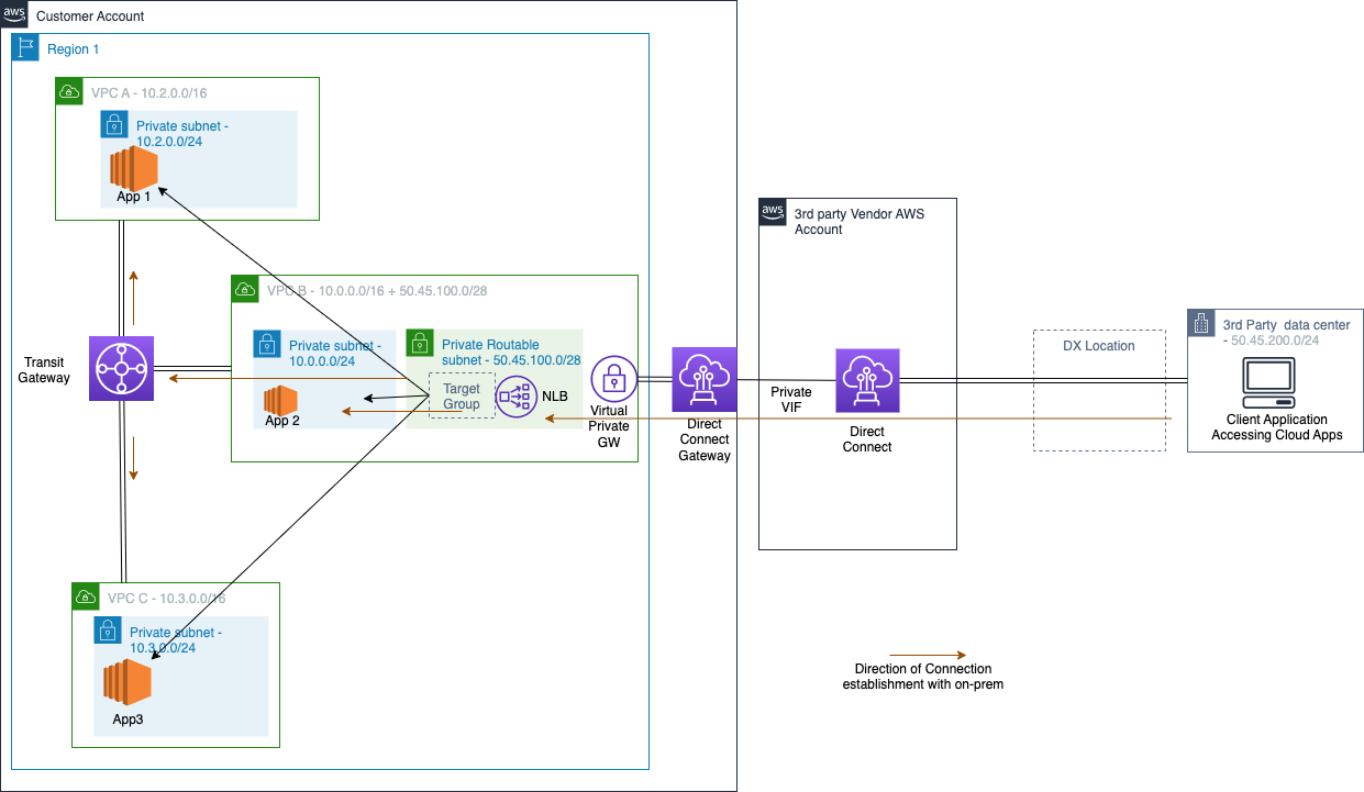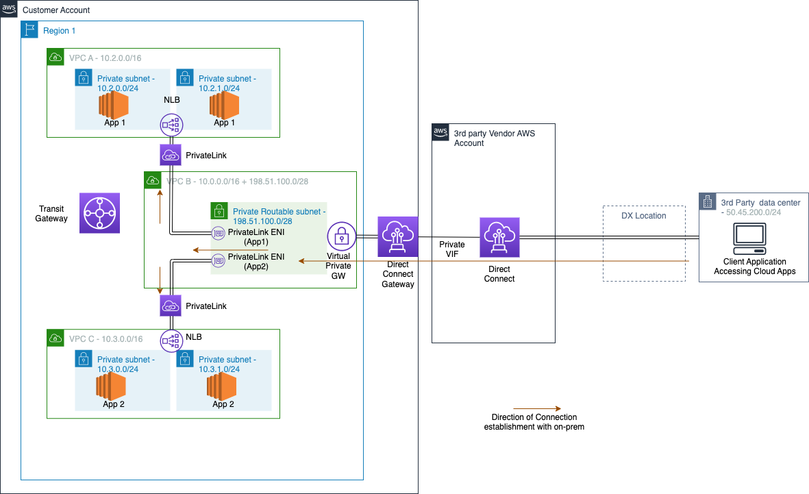 We achieve this architecture using an NLB as the front end of your applications (shown as App1 in VPC A and App2 in VPC C) and expose them over PrivateLink to the Private Routable Subnet of VPC A, as shown in figure 4. Using PrivateLink exposes the application to multiple third-party on-premises clients connecting from different VPCs. Moreover, this approach allows for handling TCP based applications. We show a Transit Gateway in the previous figure to show that it may be present in your environment, but it won’t take part in the traffic flow in this architecture.