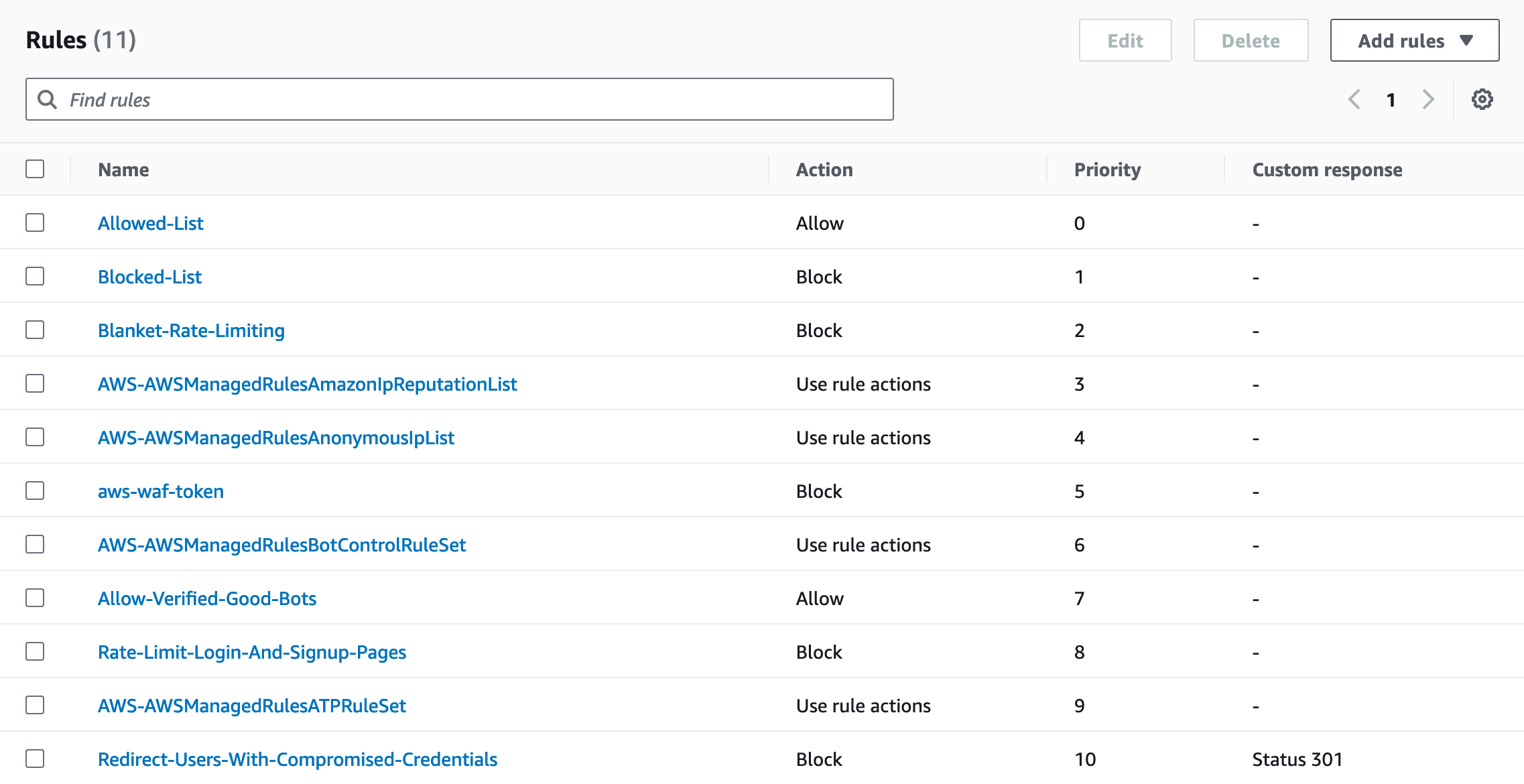 Now that you understand the evaluation logic, you can start building the AWS WAF rule set. It’s a good idea to start with an Allow and Block list as the first two rules. This makes sure that you let known good traffic through and block known malicious sources without any additional processing.
