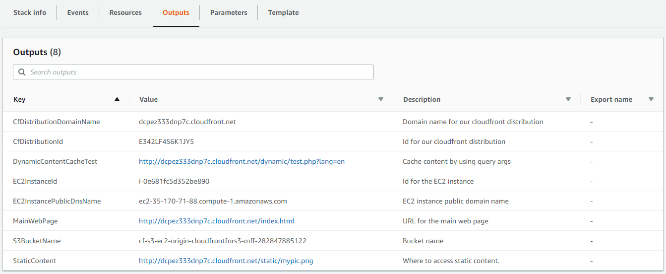 b) Find the website URL by going to the CloudFormation Stack that you just created. Go to the Outputs tab within the stack page. There you can see the website URLs for static and dynamic content displayed, as shown in the following screenshot:
