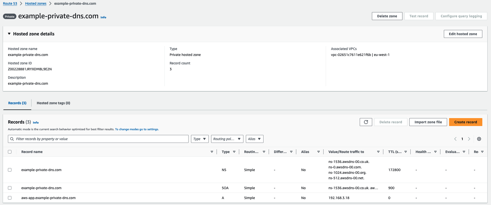 As mentioned in Figure 10, the domain example-private-dns.com is a private hosted zone attached to the VPC in which the inbound endpoints are created. It is essential that the private hosted zone is associated with the VPC where the inbound endpoints are located. Otherwise, name resolution will fail.