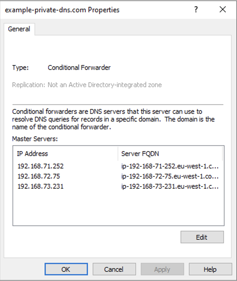 Next, the on-premises DNS resolver is configured to forward the DNS queries to the three inbound Resolver endpoint IP addresses for the domain example-private-dns.com, as shown in Figure 12. Similarly, you need to configure for other domains hosted on AWS environments, or you can configure general DNS forwards to forward all queries to AWS inbound endpoint DNS service.