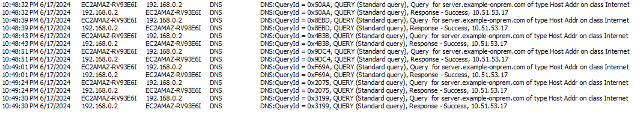 Figure 7: Wireshark capture of DNS Server 2 hosting example-onprem.com and receiving DNS requests from all outbound Resolver endpoints