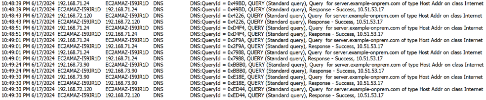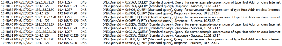 Figure 6: Wireshark capture of DNS Server 1 hosting example-onprem.com and receiving DNS requests from all outbound Resolver endpoints