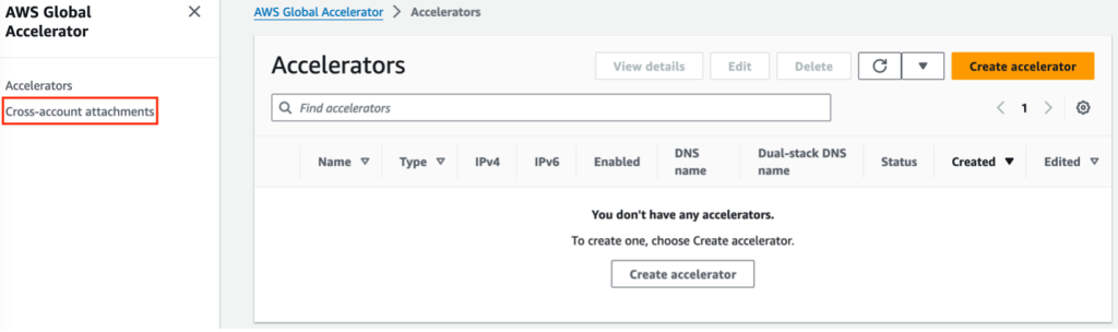 Figure 1. Screenshot of the Cross-account attachments option in the AWS Global Accelerator console