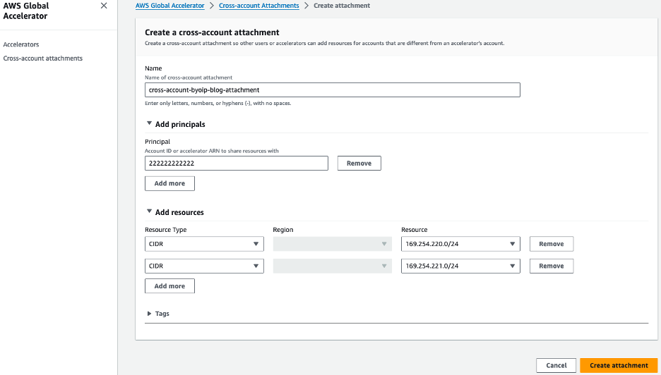To get started, sign in to the BYOIP management account in the console and create the cross-account attachment that shares and authorizes cross-account support for the BYOIP address range.