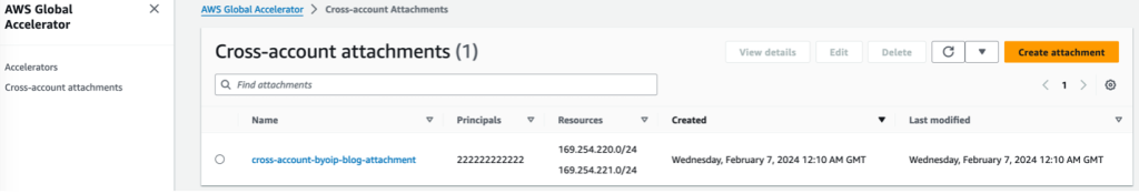 Figure 3. Screenshot of the Cross-account attachments page in the AWS Global Accelerator console
