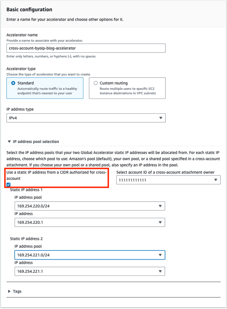 After you create the cross-account attachment, the accounts that are specified as principals in the attachment can use IP addresses from the specified BYOIP CIDR address pool as static IP addresses for accelerators. The following example illustrates how you can do this by signing in to the console with the accelerator account, 222222222222, and then creating an accelerator.