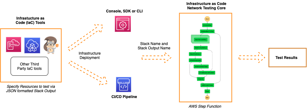 Infrastructure created using any infrastructure as code tool will need to output a JSON formatted string specifying the source, destination and tag for each of the route to be tested. For stacks deployed via AWS Console, SDK or CLI, the tester takes that output value of the stack as its input and then runs post infrastructure deployment to validate the network paths created in your topology. If the infrastructure is deployed via a CI/CD pipeline, the tester can be integrated into the testing phase of the pipeline prior to deploying to production.