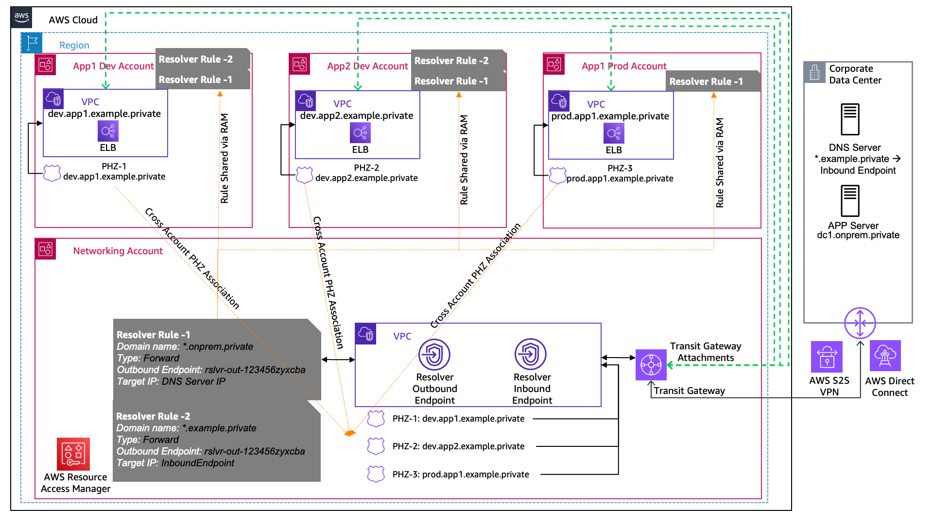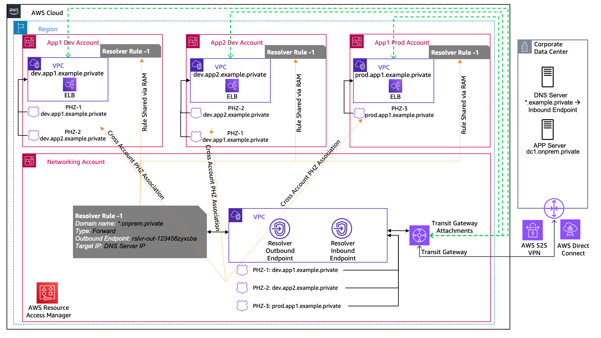 - Integrating new accounts and VPCs into the DNS setup requires multiple steps involving coordination with individual account owners and application teams. These steps include associating relevant PHZs with the new VPCs, sharing Route 53 Resolver rules through AWS RAM, and selectively applying PHZs based on the environment (such as production or non-production). The process can be cumbersome and error-prone for large environments.