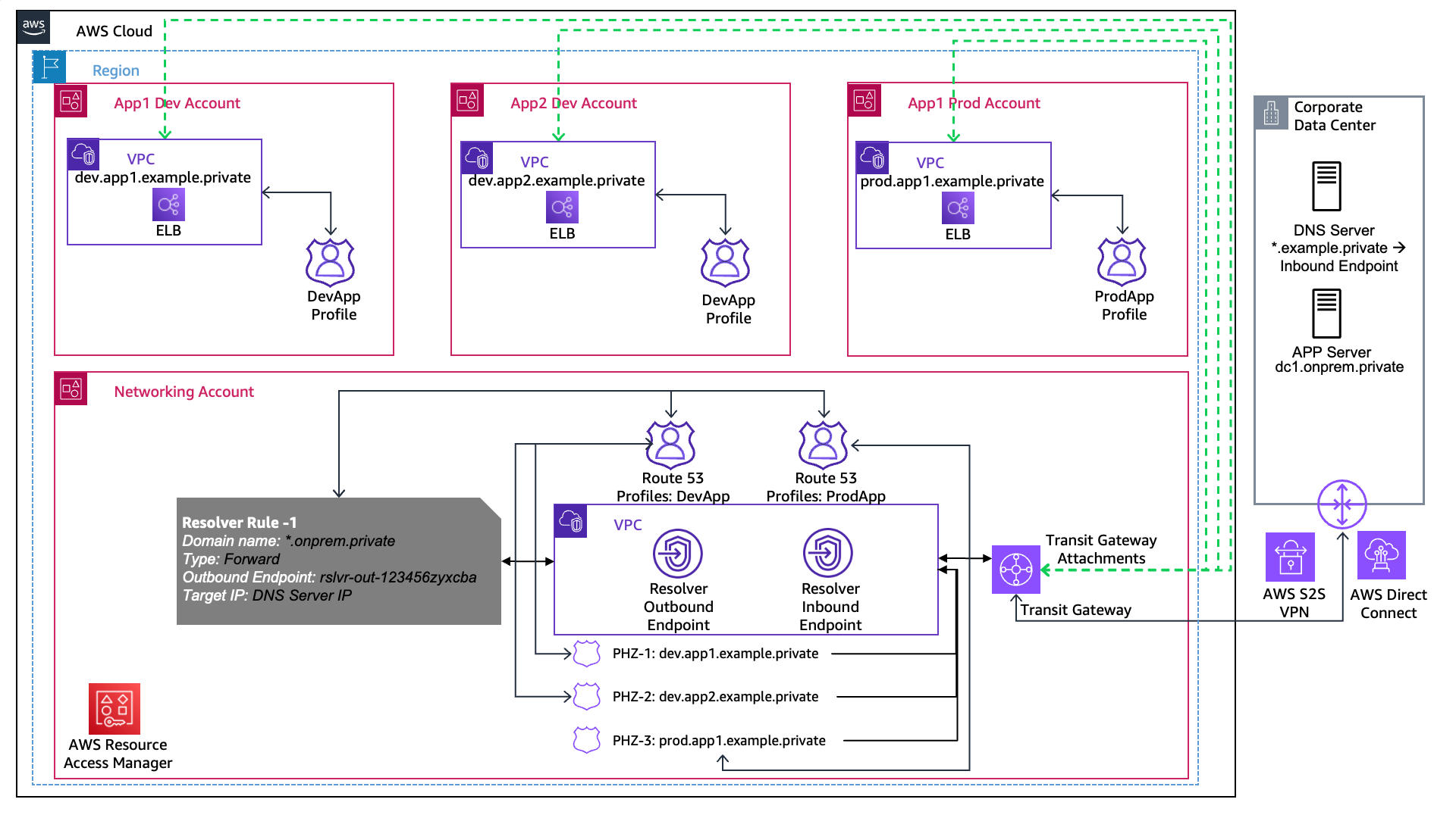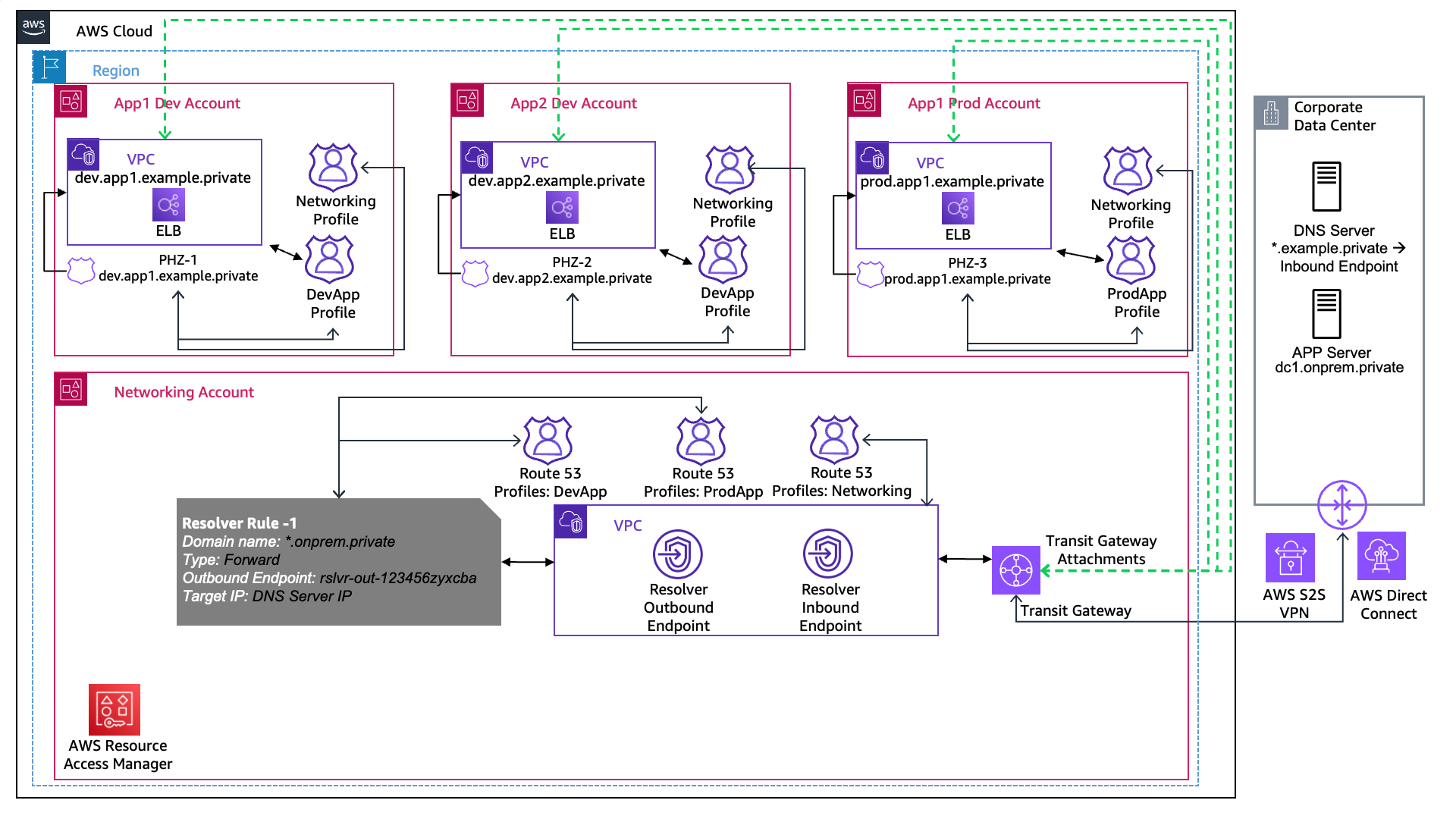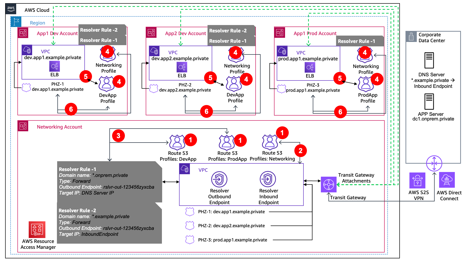 - Share Route 53 Profiles: DevApp with App1 Dev and App2 Dev Account, and Route 53 Profiles: ProdApp with App1 Prod Account using AWS RAM.