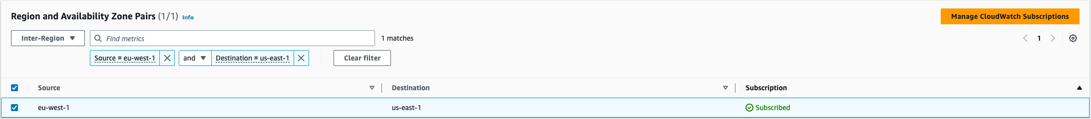 To turn on monitoring using CloudWatch, select the respective source and destination where Source=eu-west-1, and Destination=us-east-1