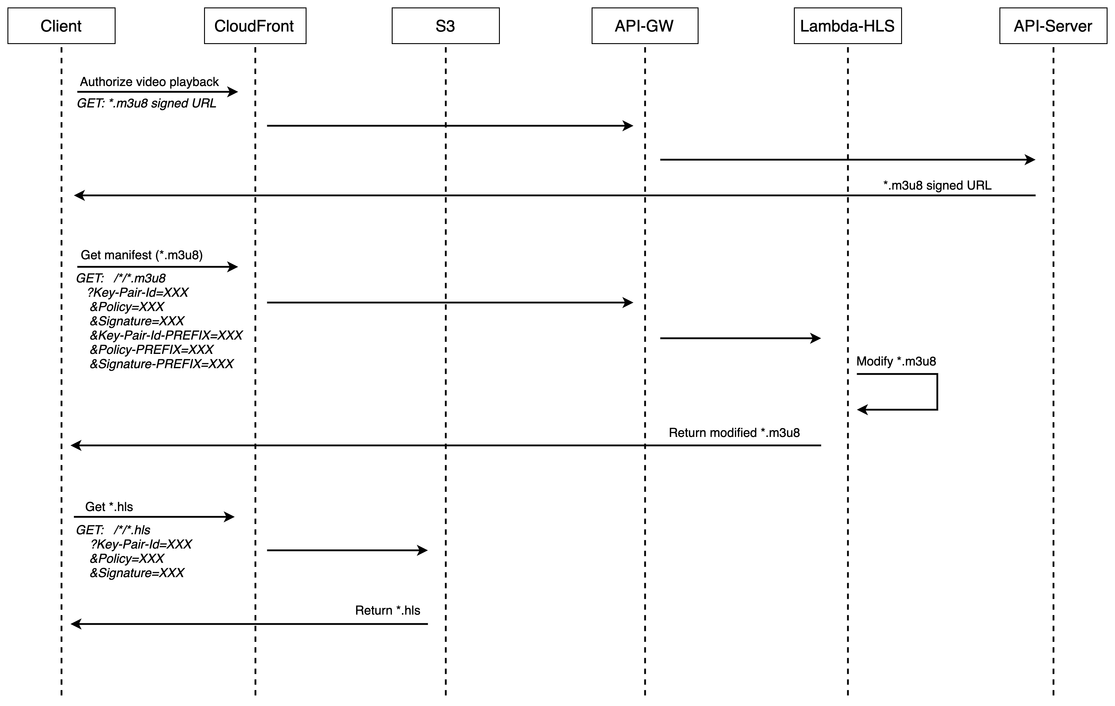- Client requests *.m3u8 file, passing custom query params Key-Pair-Id-PREFIX, Policy-PREFIX and Signature-PREFIX.