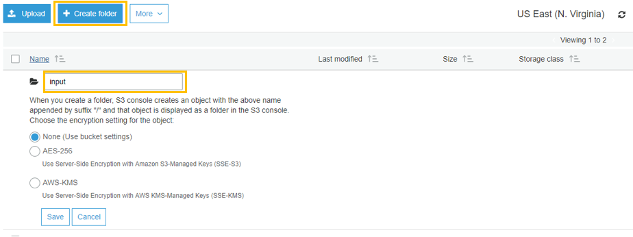 Select the new CloudFormation Stack, and, on the Outputs tab at the bottom of the page, make note of the new BucketName. In the AWS Management console, open the S3 console, and then select the new bucket that you just created. In the bucket, create a folder using the inputPrefix name that you specified earlier. If you didn’t change the default inputPrefix, name the folder in your S3 bucket input. Optionally, repeat the steps to create an Output folder. If you didn’t change the name of the output folder for the OutputPrefix parameter earlier, name the folder output.