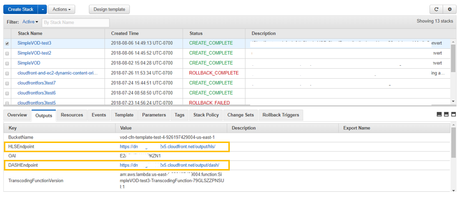- Locate the DASHEndpoint and HLSEndpoint URLs by going to the CloudFormation Stack that you just created. The HLSEndpoint and DASHEndpointSelect URLs are displayed on the Outputs tab at the bottom of the page, as shown in the following screenshot: