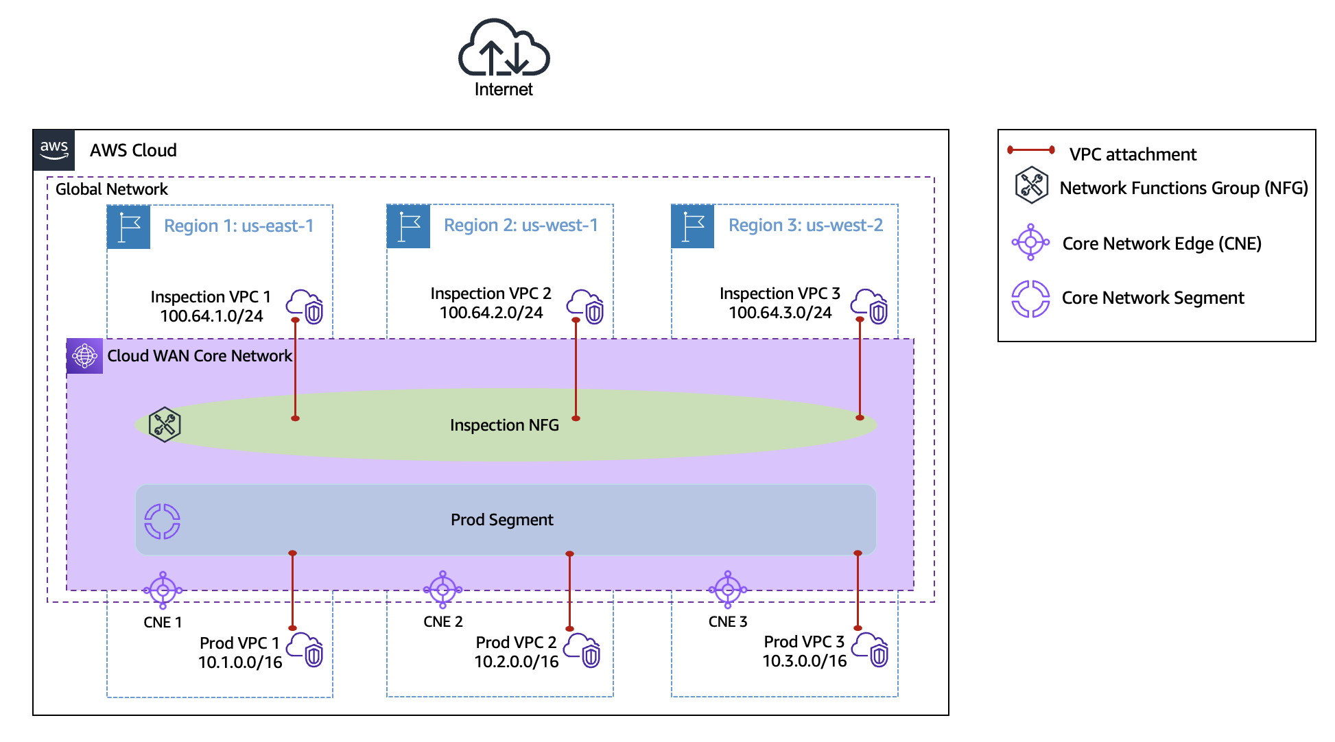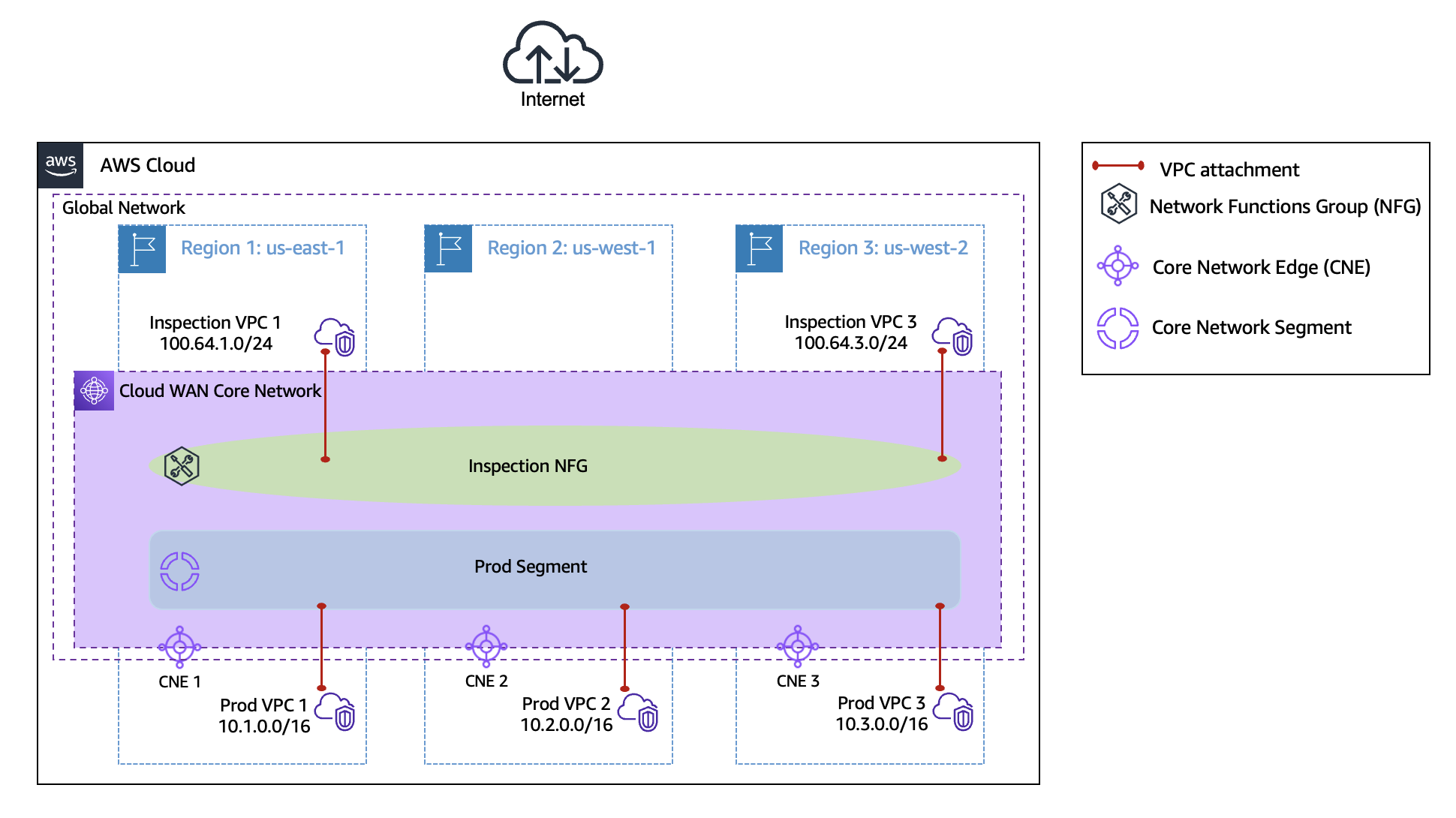 Figure 3 shows the distribution of resources across three AWS Regions: us-east-1, us-west-1, and us-west-2. Each AWS Region comprises two VPCs: a Prod VPC and an Inspection VPC. The Prod VPCs are mapped to the Prod segment, while the Inspection VPCs are mapped to the InspectionNFG NFG. This multi-Region deployment expands upon the previously described single-Region architecture.