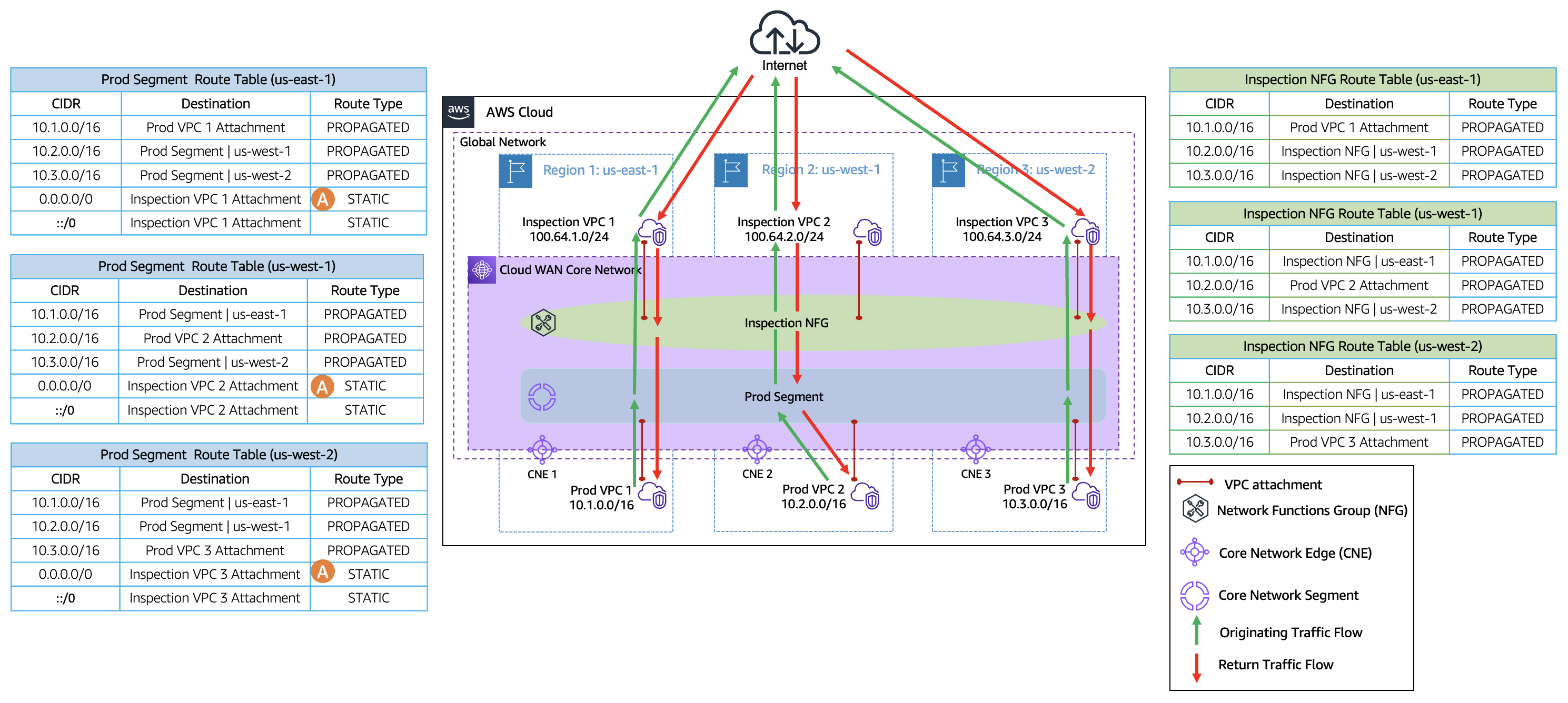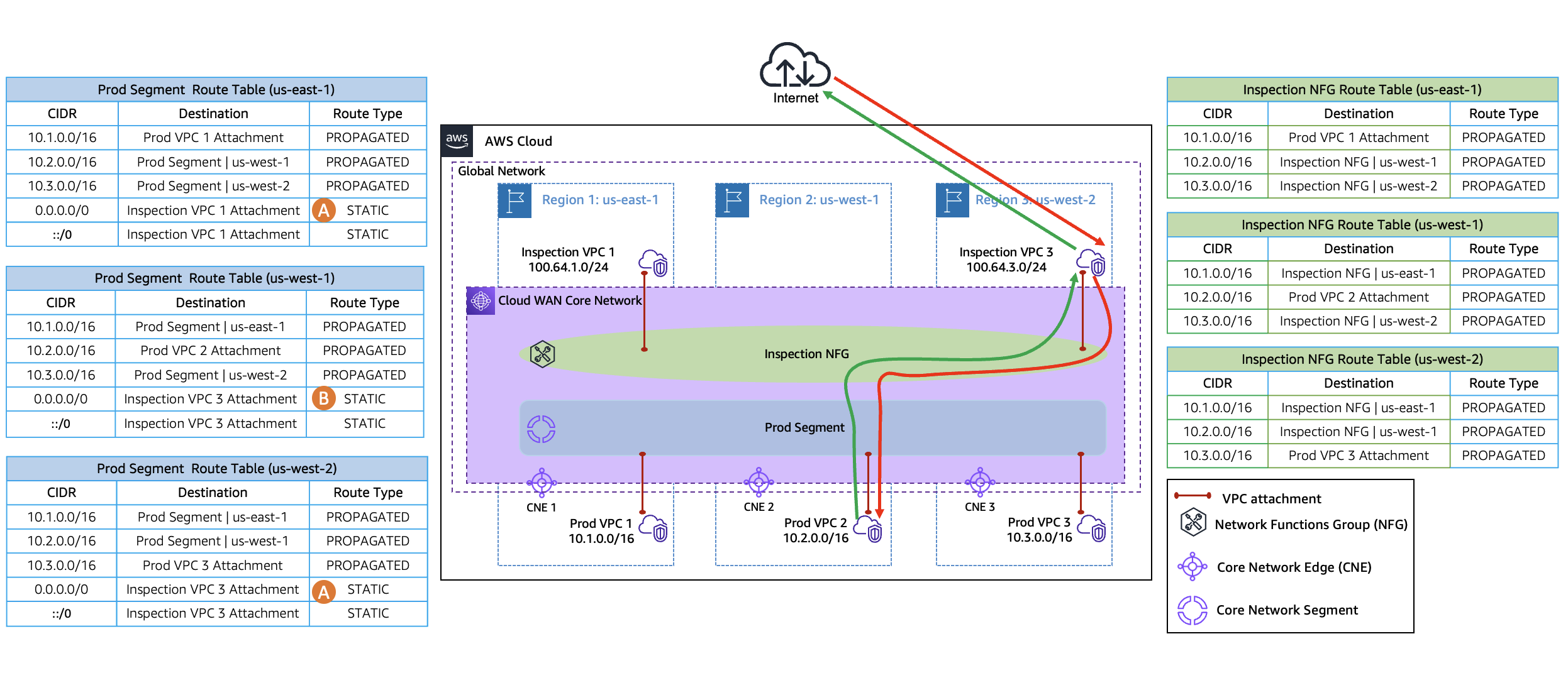 InspectionNFGroute table, with Prod VPC 1 attachment as the next hop. Routes propagated within the same Region have their next hop redirected to the local NFG attachment. - Add a 0.0.0.0/0 and ::/0 routes in the Prod Segment route table, with the next hop set as the local NFG attachment.