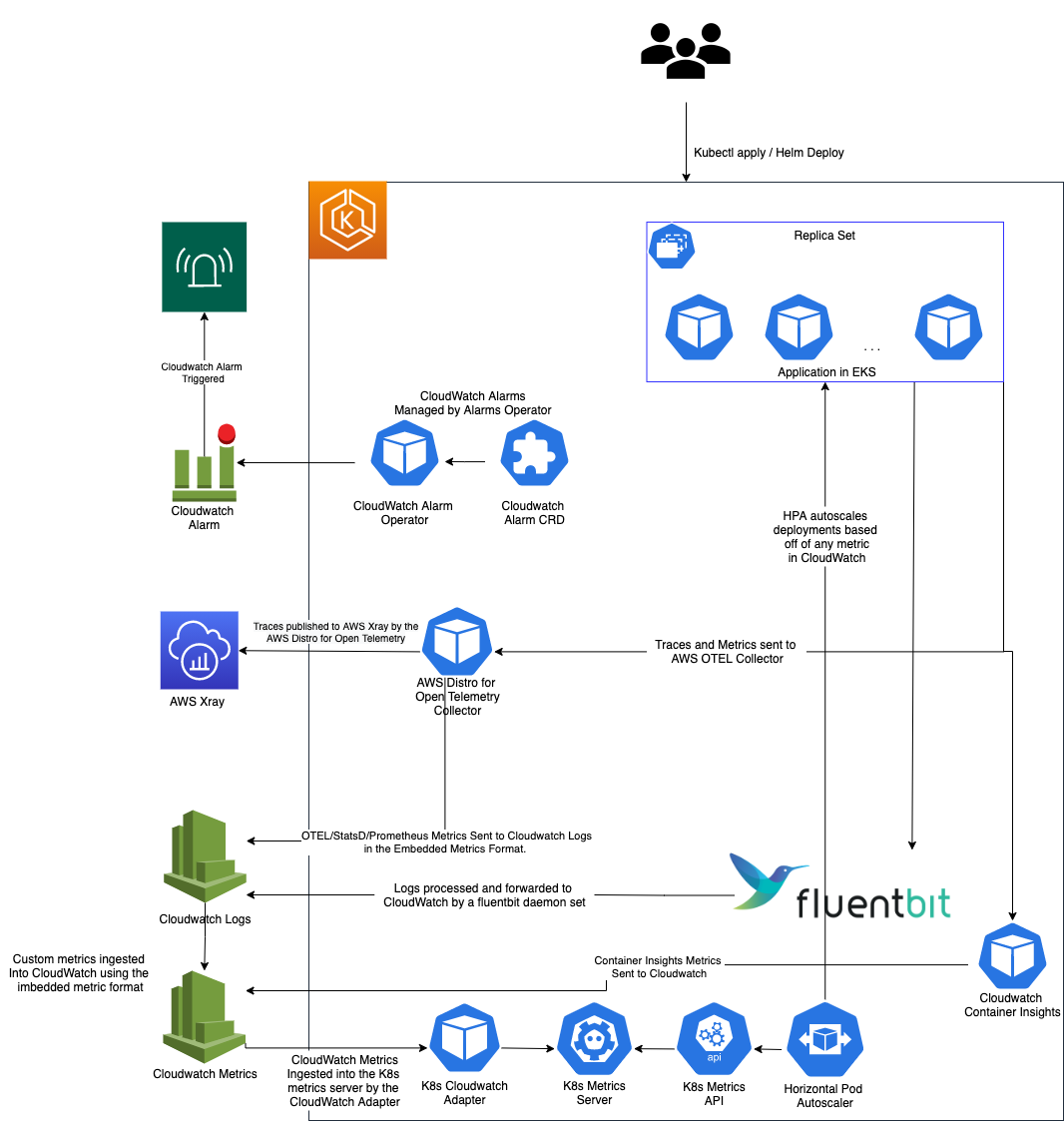 We have provided a sample application to show how we put all of these pieces together to define an application in a Kubernetes manifest and instrument it with end-to-end observability via CloudWatch, including custom metrics, alarms, and scaling policies based on CloudWatch Metrics (Figure 2).