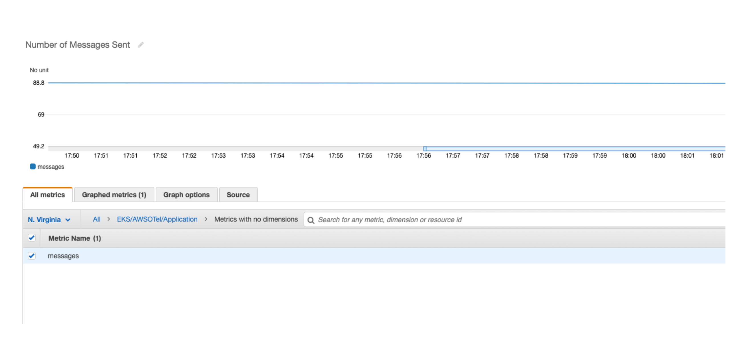 - You should be shown a graph like the one in Figure 3, displaying the number of messages produced by the sample application. This is a custom metric emitted by StatsD and forwarded to CloudWatch via the OTEL Collector.