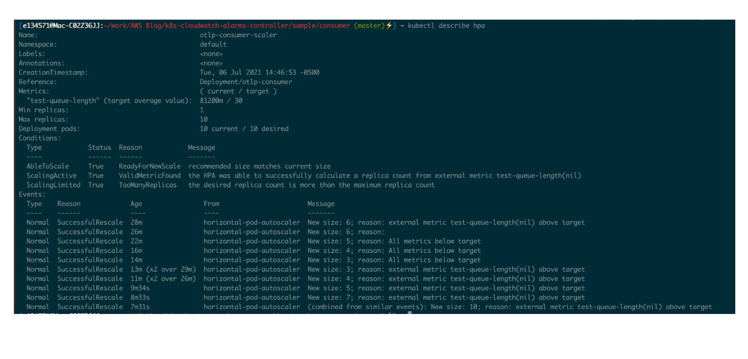 kubectl describe hpa - In Figure 5, the HPA scaled the number of consumers up to five within 15 minutes of running the application. The HPA will eventually scale the consumers to their maximum size of 10.