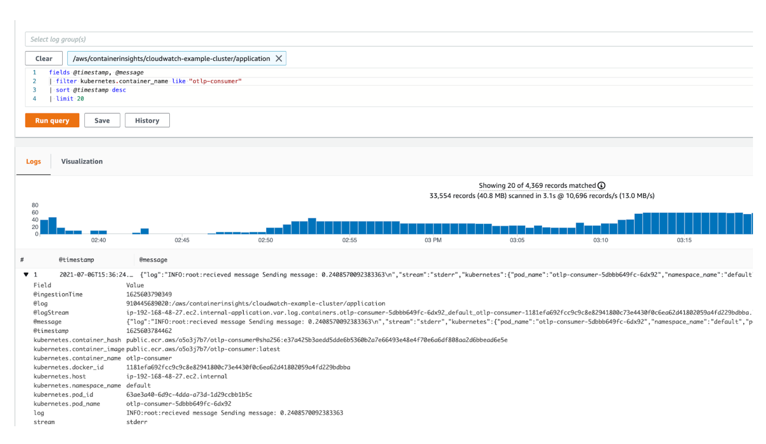 Now that the logs are forwarded, parsed, and indexed into CloudWatch logs, you can search, visualize, generate metrics, and even create dashboards from the logs with Amazon CloudWatch Logs Insights. The example application writes a log entry every time it sends a message or processes a message from the SQS queue. The application logs are written to the /aws/containerinsights/cloudwatch-example-cluster/application log group.