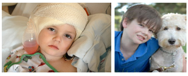 Left – Evan at age four after his first brain surgery, a three-stage focal resection, which left him seizure free for several years. Right – Evan at age eight with his service dog, Mindy, who has the ability to detect the onset of some of his seizures.