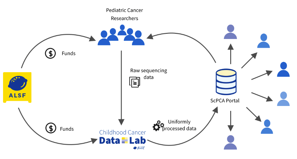 Figure 1. Alex’s Lemonade Stand Foundation provides funding to pediatric cancer researchers and the Childhood Cancer Data Lab (Data Lab). Researchers provide raw sequencing data to the Data Lab, which then uniformly processes the data for the ScPCA Portal, making the data accessible to researchers worldwide.
