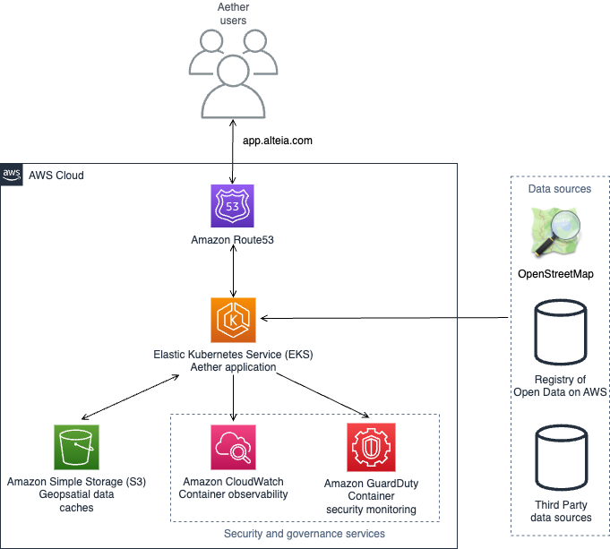 Alteia developed a microservices architecture utilizing Amazon EKS, a managed Kubernetes cluster solution. This application seamlessly integrates data from third-party sources and Amazon S3 to enable storage of large geospatial datasets and faster analysis through efficient data access. Alteia provides the security and observability of their platform using Amazon GuardDuty for threat detection and Amazon CloudWatch for monitoring and logging.