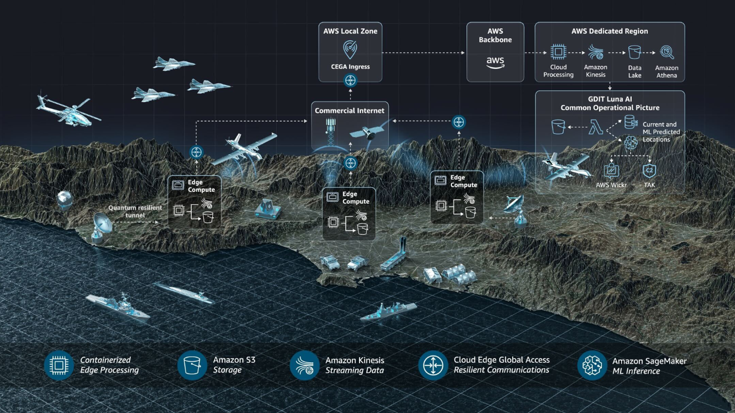 This integration of advanced analytics and cloud services ensures that DOGMA can meet the dynamic needs of modern military operations by providing real-time insights and forecasts critical for mission success. Using DOGMA, AWS and GDIT demonstrated artificial intelligence (AI) predictive modeling of drone threats both in the AWS Cloud and at the edge.