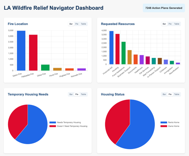 By analyzing thousands of community submissions, the platform provided leaders with clear, data-driven insights into the recovery process—helping them understand evolving needs, improve coordination among partners, and identify where support efforts were having the greatest impact. This integration of technology and public service turned raw data into actionable intelligence—enabling a faster, more informed, and more equitable recovery across Los Angeles.