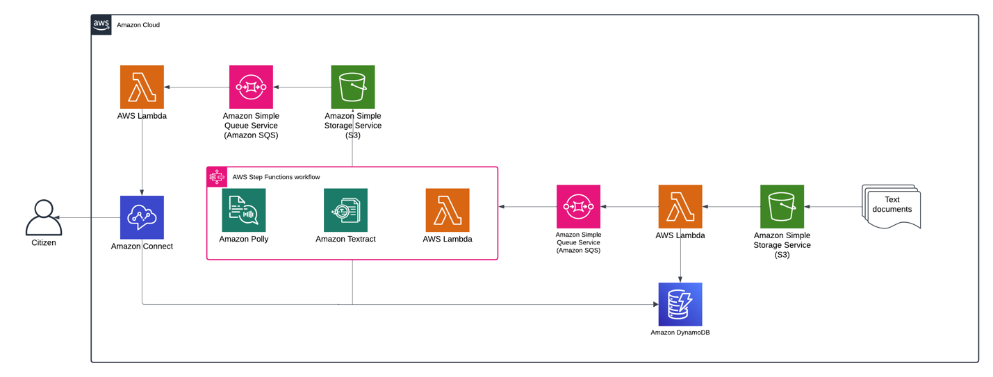 The following figure illustrates a serverless workflow through which text documents are processed by multiple AWS services. Documents stored in Amazon S3 trigger a processing pipeline that uses AWS Step Functions to coordinate Amazon Textract for text extraction and Amazon Polly for text-to-speech conversion. Amazon Connect provides the interface for citizens to access the audio output, while Amazon DynamoDB tracks the processing status.