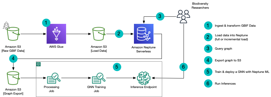 The PKB uses AWS Glue to ingest and transform data stored in Amazon Simple Storage Service (Amazon S3). AWS Glue gives the NHM team the ability to prepare the GBIF dataset and any other datasets they require in a fast and simple manner. The team uses an AWS Glue PySpark notebook in order to filter specific data and generate load files that will hydrate an Amazon Neptune serverless database.