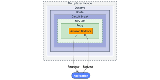 The following diagram shows how these concerns compose within the facade around every Amazon Bedrock API call. A request passes inward through each layer to reach Amazon Bedrock, and the response returns outward through the same layers in reverse.