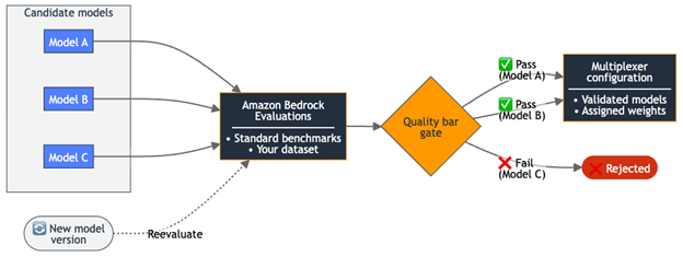 Figure 1: Evaluation-to-routing pipeline— models that pass your quality bar are promoted to the multiplexer configuration directly as a configuration change