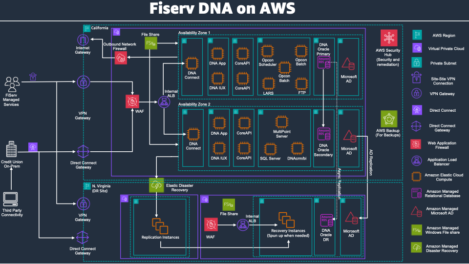 The following diagram shows the architecture that California Credit Union is working on implementing as part of their larger strategy of running DNA and other banking systems on AWS: