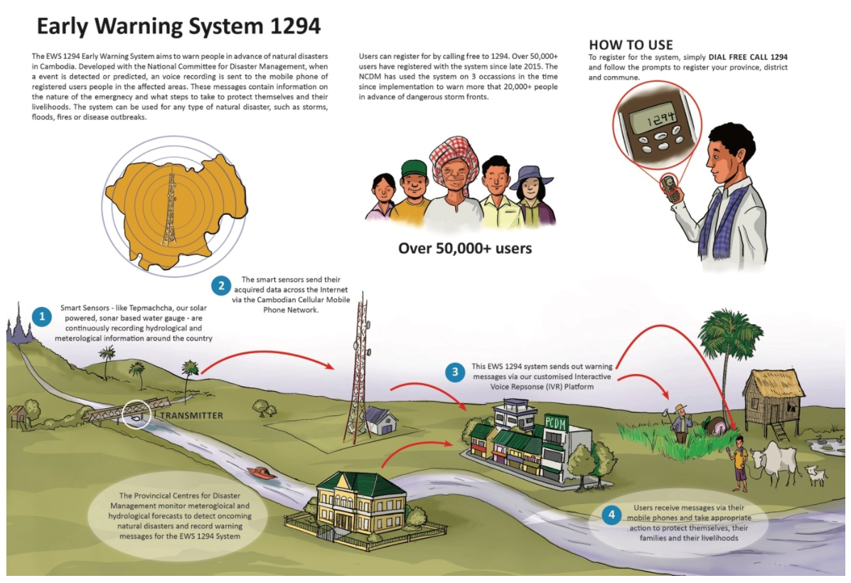 Kingdom of Cambodia: The 2013 floods in Cambodia covered almost half the country and affected nearly 1.7 million people. More than 50 people lost their lives and hundreds of thousands more were left homeless. People in Need Cambodia, a non-governmental, nonprofit organization, developed the Tepmachcha, a solar-powered, GSM-enabled, sonar-based stream gauge, built on open-source technology. These flood detection units improve the existing methods of flood forecasting and early warning in Cambodia. See here for more.
