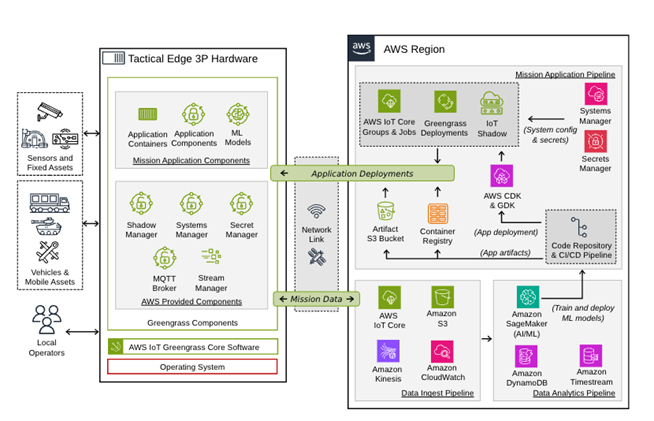 A major issue we see customers face when fielding autonomous unmanned/uncrewed systems is the ability to securely deploy and update autonomous unmanned/uncrewed systems at scale. The robust edge computing and Internet of Things (IoT) capabilities of AWS and our experience across industries like automotive and oil and gas, provides a critical foundation for building comprehensive autonomy deployment solutions that take the innovated capabilities battlefield at scale. Through services like AWS IoT Core and AWS IoT Greengrass and related solution guidance like Tactical Edge Application Deployment on AWS and Cloud Edge Global Access (CEGA), we enable secure, low-latency operations at the tactical edge. Our reference architecture showcases how continuous integration/continuous deployment (CI/CD) pipelines ensure secure, rapid updates to autonomous unmanned/uncrewed systems.