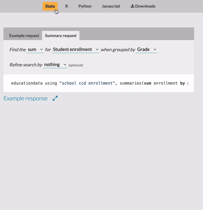 Figure 1. The Education Data Portal summary endpoint functionality lets users compute aggregated statistics against millions of rows within seconds using different programming languages. This example shows how to generate Stata and R syntax to summarize K-12 student enrollment data.