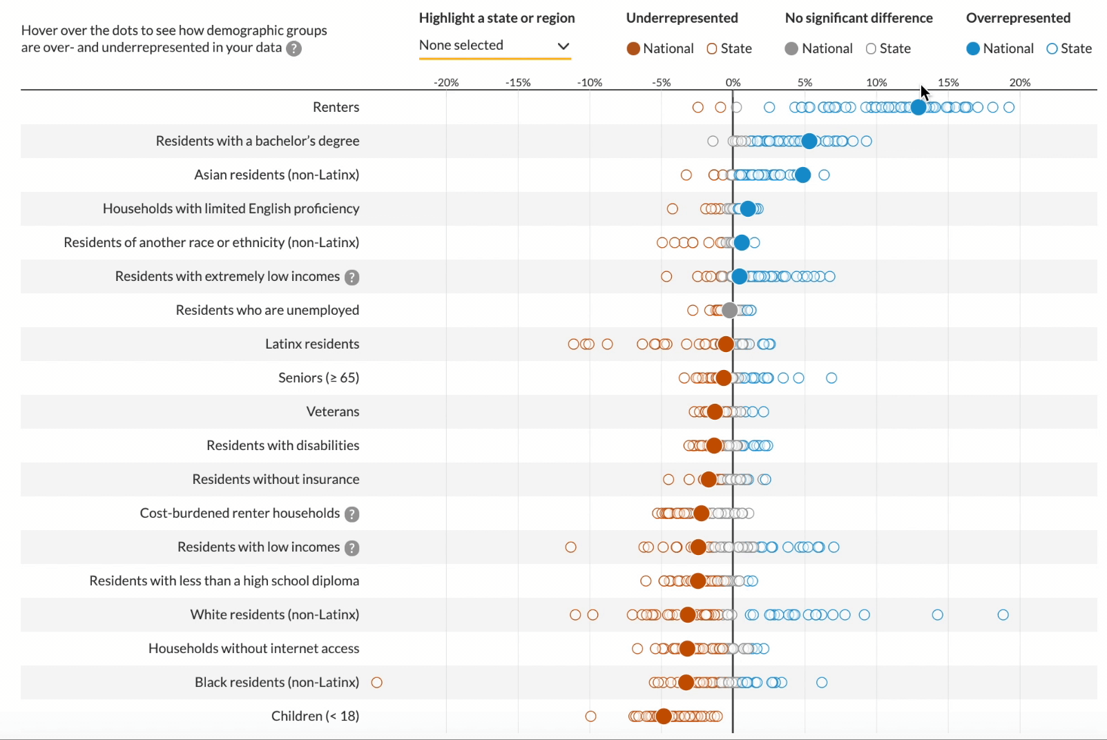 Figure 2: The SEDT lets users see how different demographic groups are over- and under-represented in a dataset. This example displays demographic disparity scores for a dataset of electric vehicle charging stations from the U.S. Department of Energy.