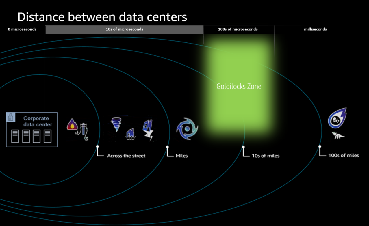 Figure 1. The Goldilocks zone in disaster recovery is the right amount of distance between data centers that keeps latency below one millisecond while protecting organizations’ data from natural disasters in a specific region; the Goldilocks zone is typically in the tens of miles range between data centers. Beyond tens of miles of distance between data centers—in the hundreds of miles range—the types of disasters mitigated would be extinction level events.