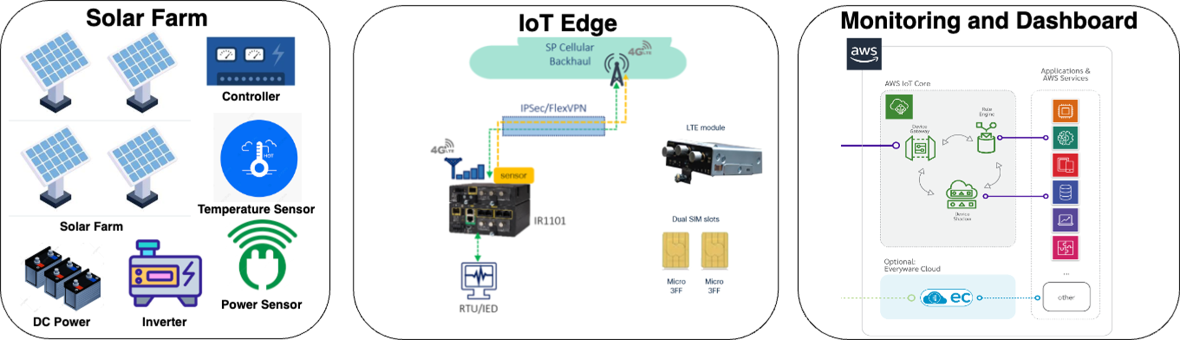 Figure 1. High-level design illustrates the connectivity of a solar farm in sub-Saharan countries to the AWS Cloud via modems utilizing multiple SIM cards.